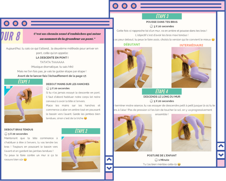 💬 : Ce E-book comprend 20 routines différentes de 5 minutes, 4 de 20 minutes et 4 pages de motivation pour les jours de repos. Parce que cette formation est accessible à tous, quelque soit ton âge et le temps dont tu disposes !